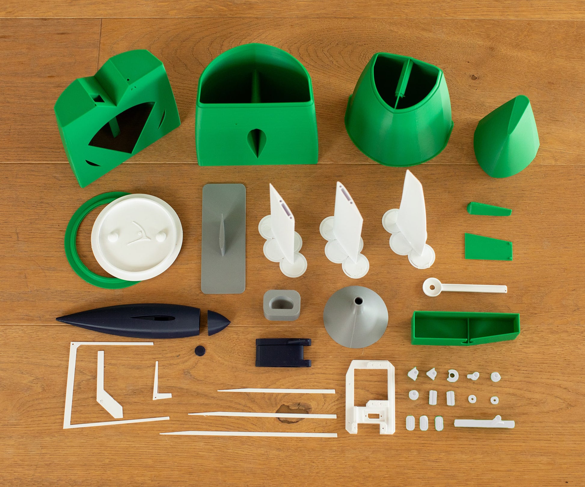 This kit includes all structural 3D printed parts required to build the RS Ranger 695. The kit comes in four color schemes, green, red, blue, yellow.